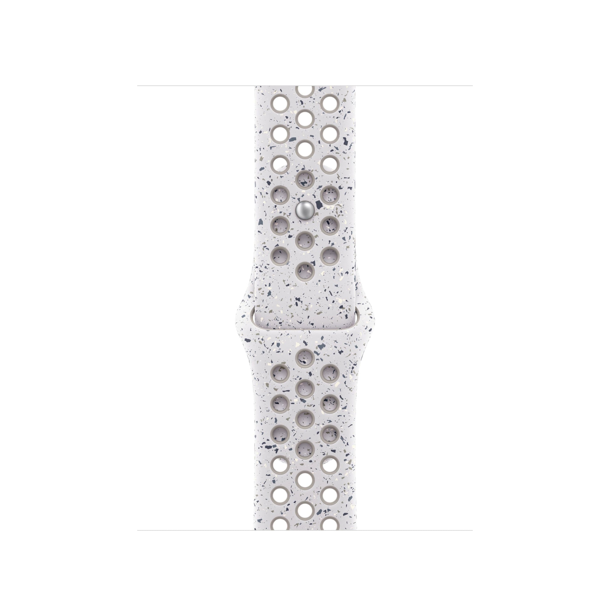 Made with compression-molded perforations for breathability, the Nike Sport Band is durable and strong, yet surprisingly soft. It features colourful flakes that create a randomized pattern, making each strap completely unique. The smooth, dense material drapes elegantly across your wrist and feels comfortable next to your skin. An aluminum pin-and-tuck closure gives the pin a fresh matte finish. This strap contains at least 30% recycled fluoroelastomer, with each flake containing at least 66% recycled fluoroelastomer.