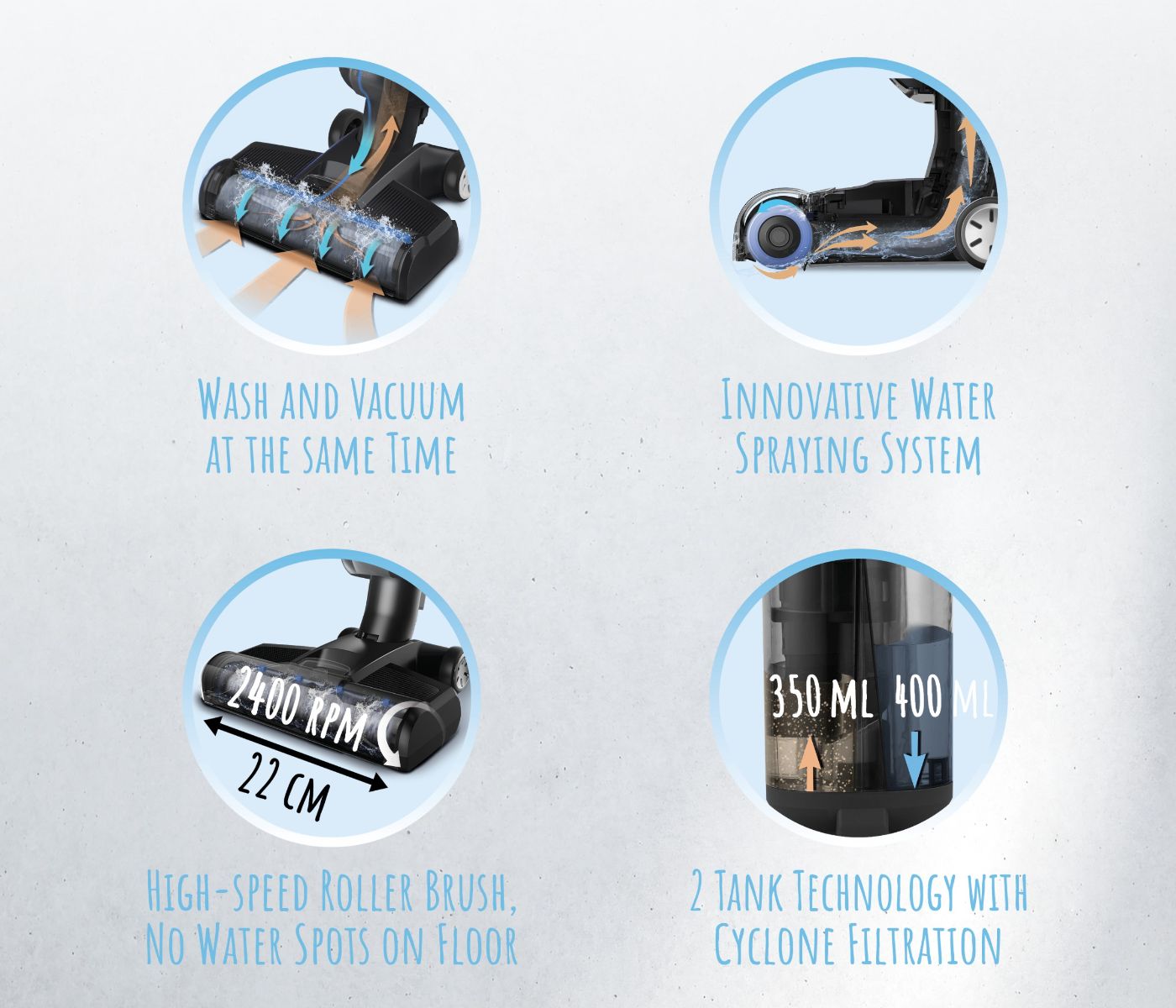 Με μια εντυπωσιακή ταχύτητα 2400 στροφών ανά λεπτό, καθαρίζει έως και 100 τετραγωνικά μέτρα σκληρού δαπέδου σε μόλις 30 λεπτά.